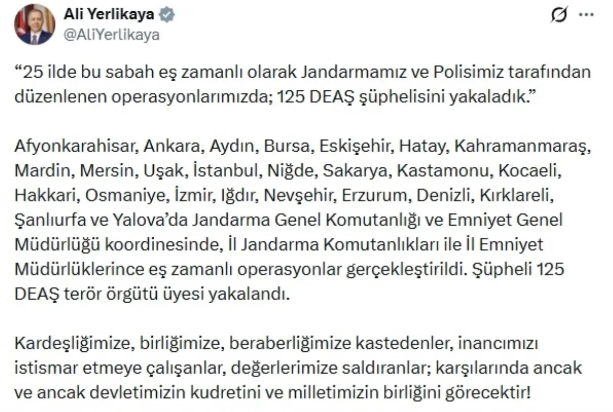 Bakan Yerlikaya, jandarma ve polis tarafından düzenlenen operasyonları sanal medya hesabından duyurdu. Buna göre; bu sabah Afyonkarahisar, Ankara, Aydın, Bursa, Eskişehir, Hatay, Kahramanmaraş, Mardin, Mersin, Uşak, İstanbul, Niğde, Sakarya, Kastamonu, Kocaeli, Hakkari, Osmaniye, İzmir, Iğdır, Nevşehir, Erzurum, Denizli, Kırklareli, Şanlıurfa ve Yalova'da eş zamanlı düzenlenen operasyonlarda 125 DEAŞ terör örgütü üyesi yakalandı. Bakan Yerlikaya, "Kardeşliğimize, birliğimize, beraberliğimize kastedenler, inancımızı istismar etmeye çalışanlar, değerlerimize saldıranlar; karşılarında ancak ve ancak devletimizin kudretini ve milletimizin birliğini görecektir" dedi.