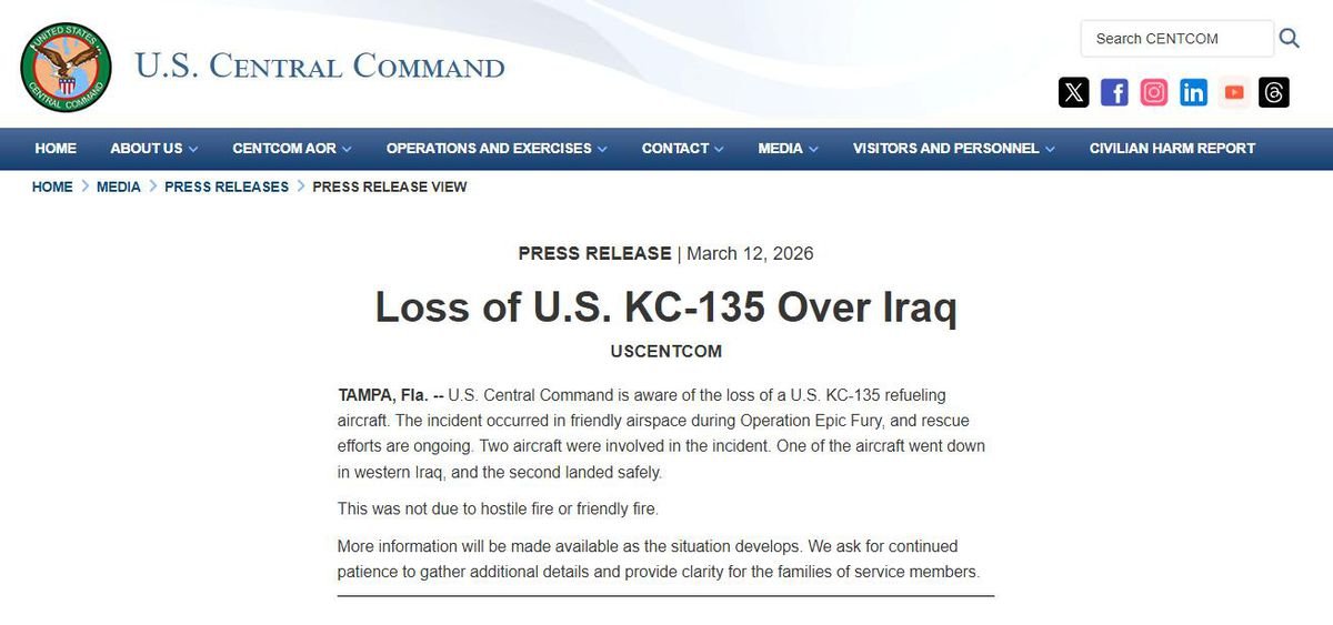ABD Merkez Komutanlığı (CENTCOM), Irak'ta bir KC-135 yakıt ikmal uçağının düştüğünü açıkladı. Kaza sırasında dost hava sahasında meydana geldiği belirtilirken, kurtarma çalışmalarının devam ettiği bildirildi.