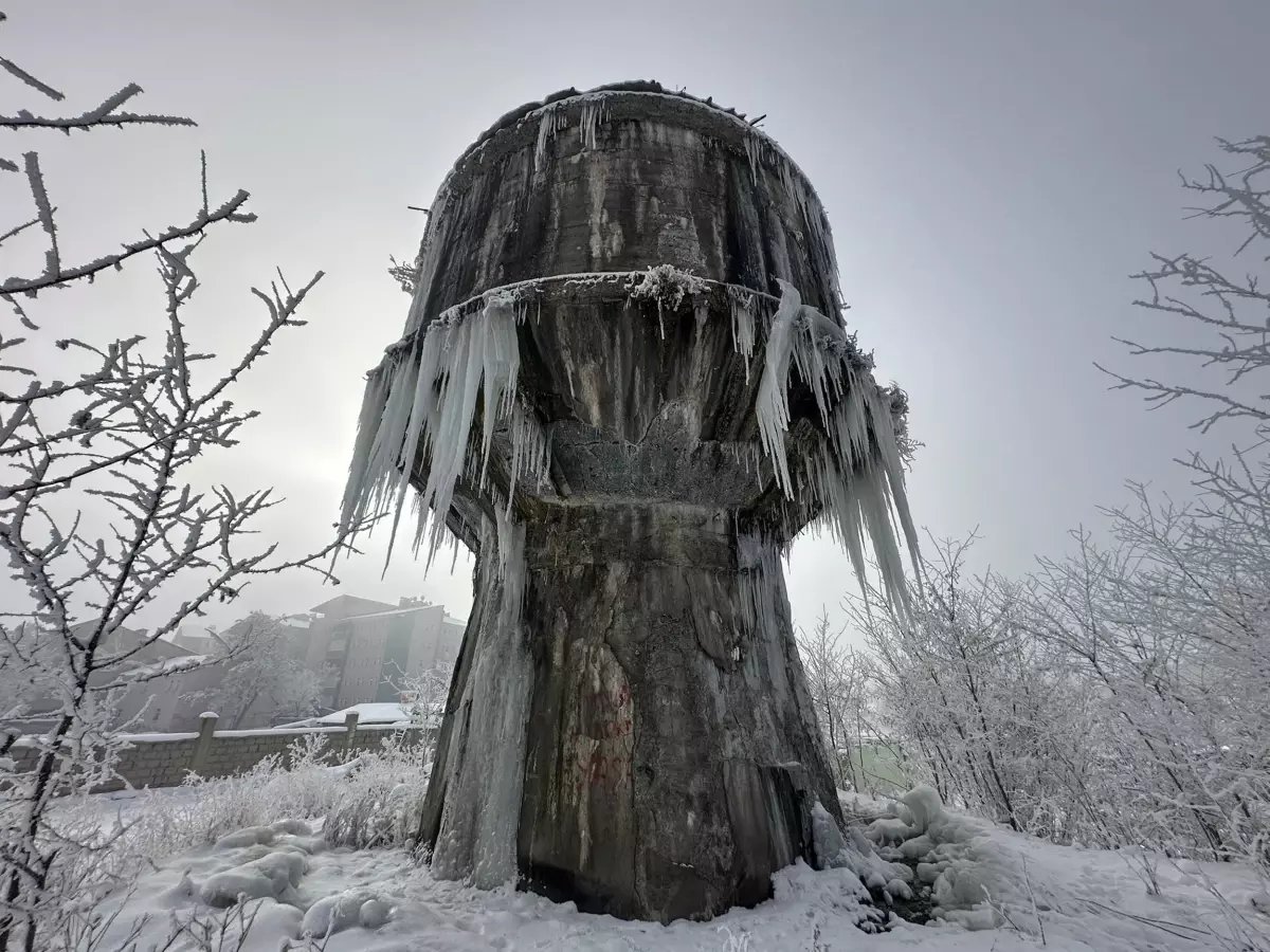 Ağrı'da en düşük hava sıcaklığı eksi 19,1 derece olarak ölçülürken, şehrin merkezindeki eski su deposu buzla kaplandı. Kar yağışının durduğu bölgede soğuk hava etkisini sürdürüyor.