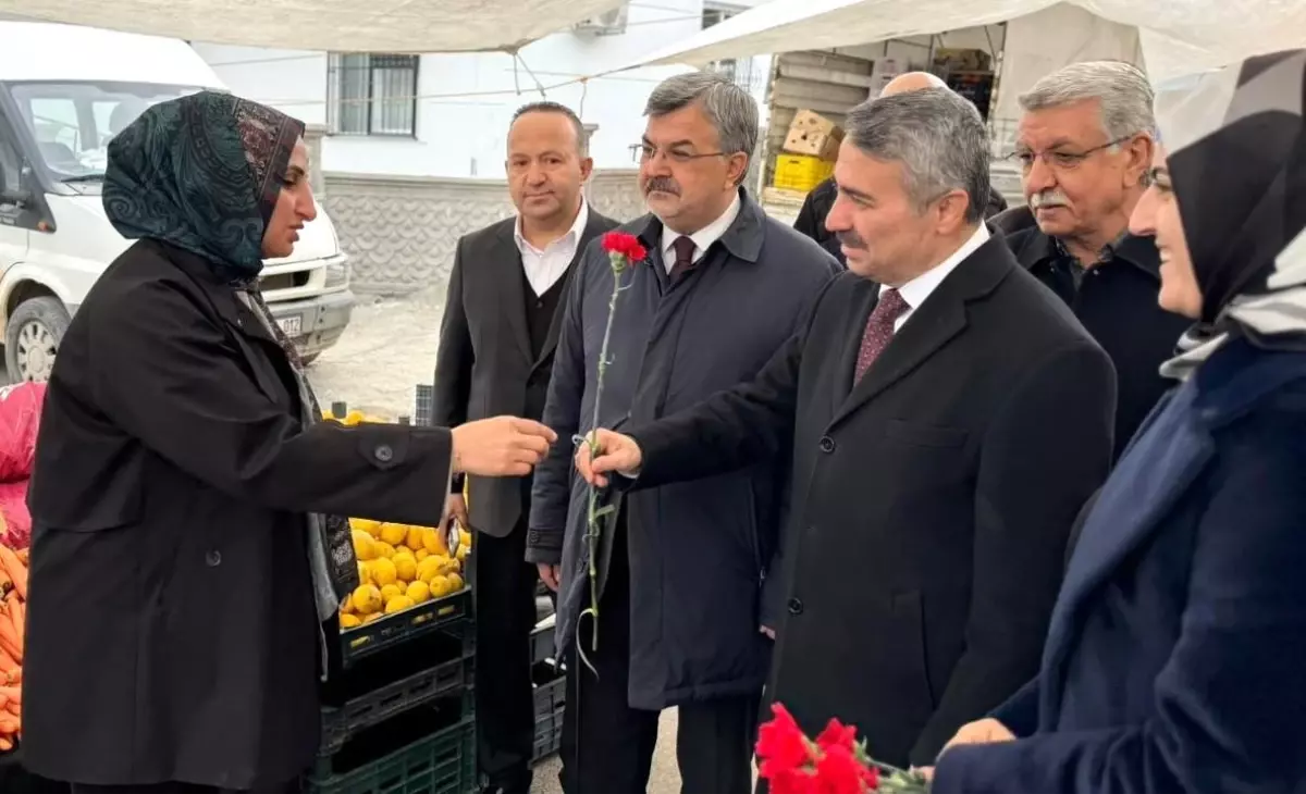 Kadınların toplumdaki yeri ve önemine vurgu yapan Milletvekili Mustafa Alkayış, "Kadınlarımız aileyi kuşatan merhameti, nesilleri yetiştiren sabrı ve emeğiyle hayatı güzelleştiren en büyük güçtür. Bugün 8 Mart Dünya Kadınlar Günü vesilesiyle pazar esnafımız ve kadın vatandaşlarımıza karanfil takdim etmekten büyük mutluluk duyuyorum. Kadınlarımıza her zaman saygı ve hürmetle yaklaşmak, medeniyet anlayışımızın en temel değerlerindendir. Başta şehit anneleri ve şehit eşleri olmak üzere tüm kadınların 8 Mart Dünya Kadınlar Günü'nü kutluyorum" diye konuştu. - ADIYAMAN