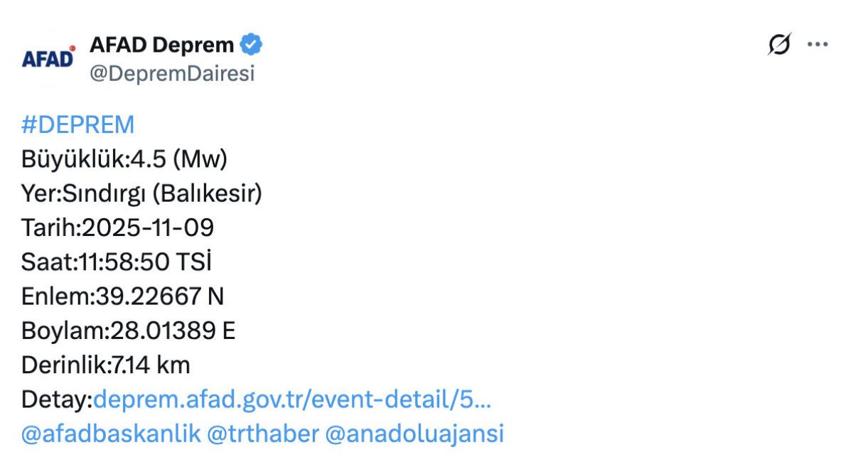 Afet ve Acil Durum Yönetimi Başkanlığı'ndan edinilen bilgiye göre Balıkesir'de saat 11.58'de deprem meydana geldi.
