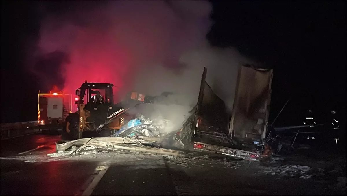İş makinesinin tır üzerindeki tekstil malzemelerini yola sermesinin ardından, itfaiye ekiplerince yangın söndürüldü.