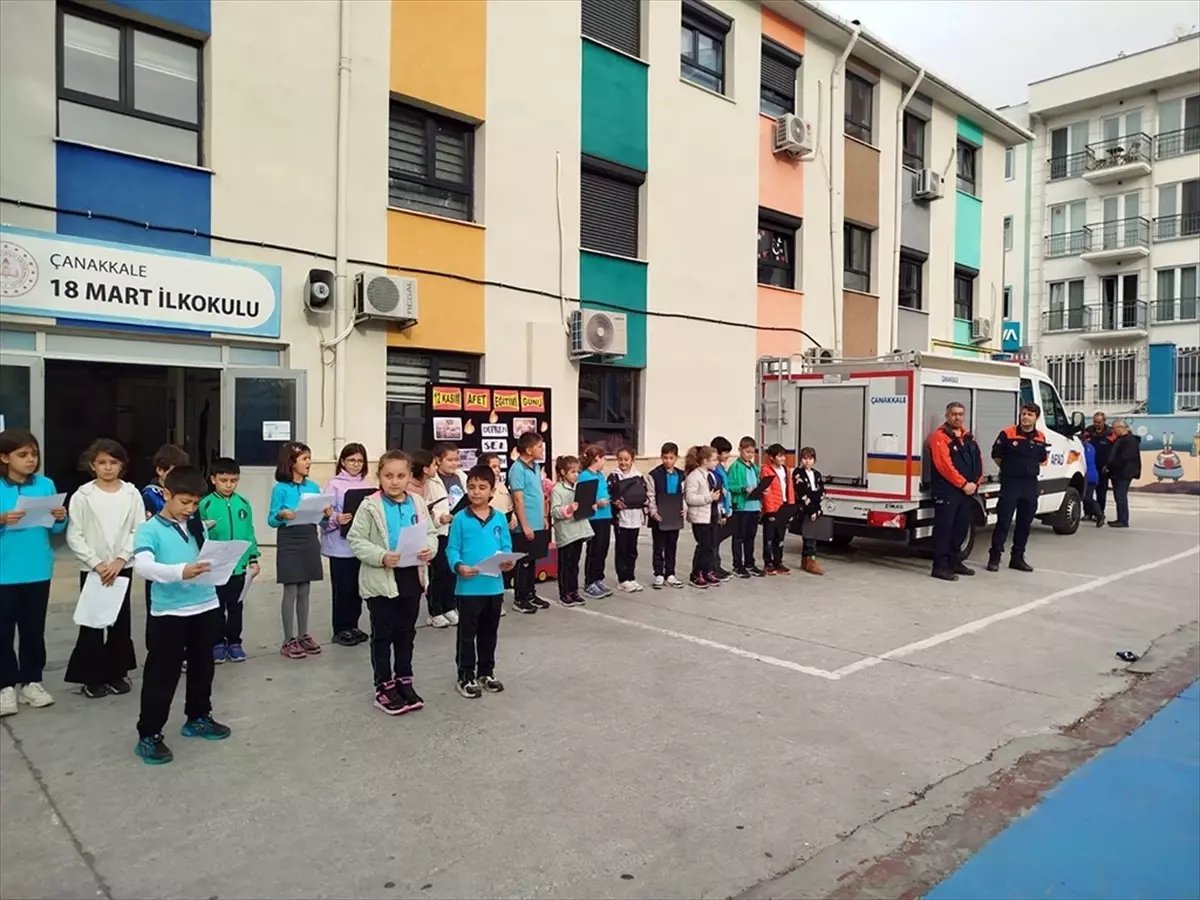 Çanakkale İl Afet ve Acil Durum Müdürlüğü tarafından 18 Mart İlkokulunda yapılan tatbikatta öğrencilere acil durum senaryoları ve tahliye yöntemleri öğretildi.