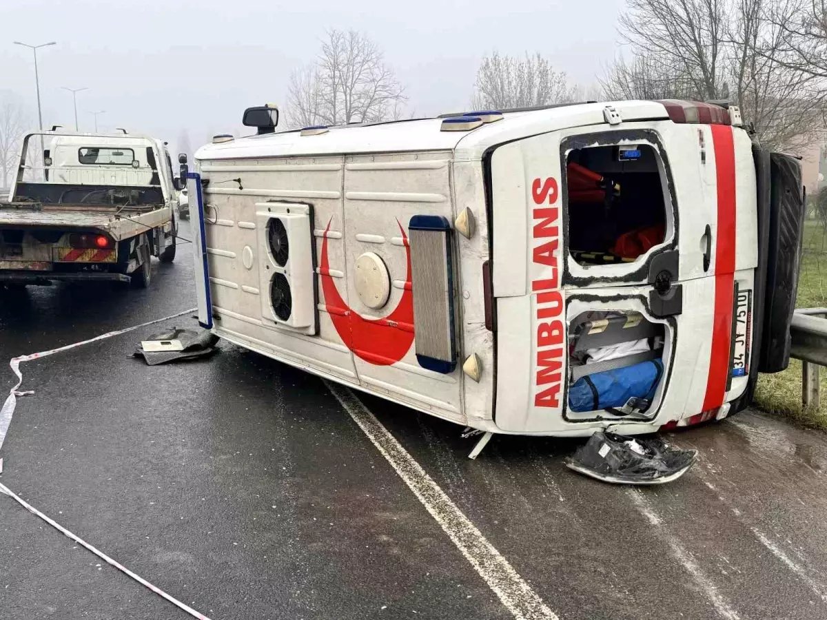 Düzce'de meydana gelen kazada, kontrolden çıkan bir ambulans bariyerlere çarparak devrildi. Sürücü ve sağlık personelinin yaralandığı kazada, hasta bulunmadığı öğrenildi.