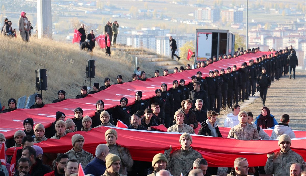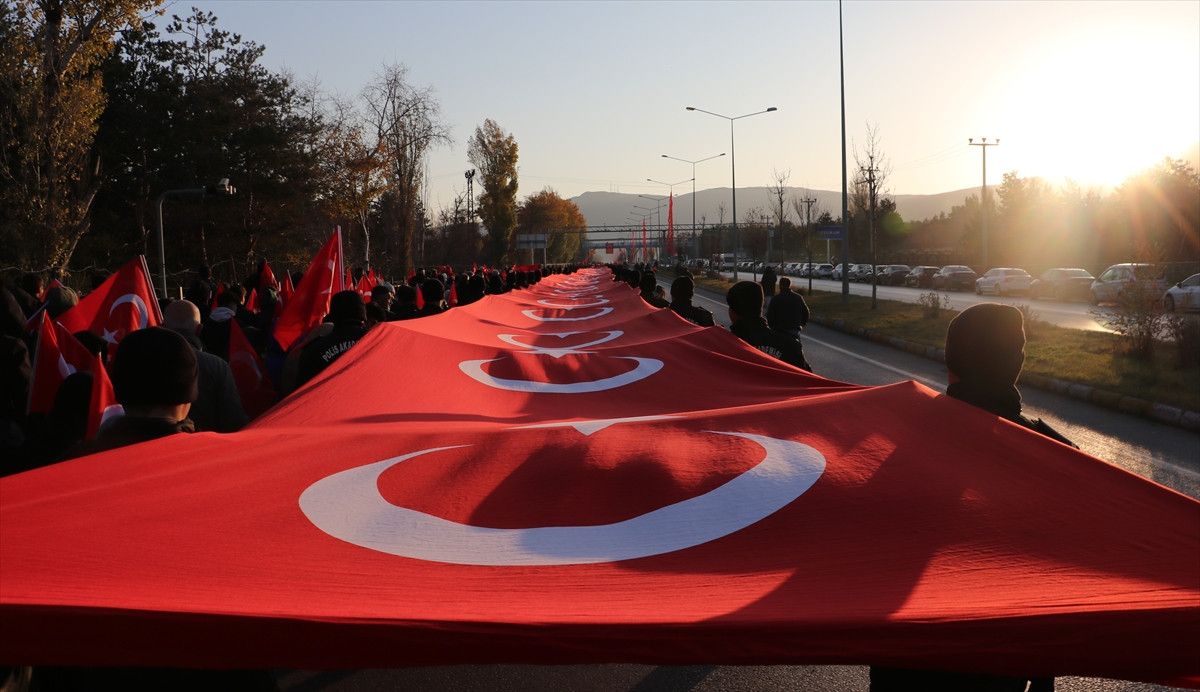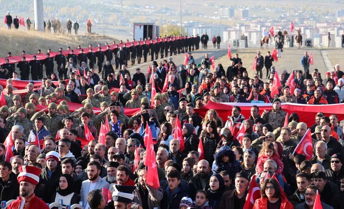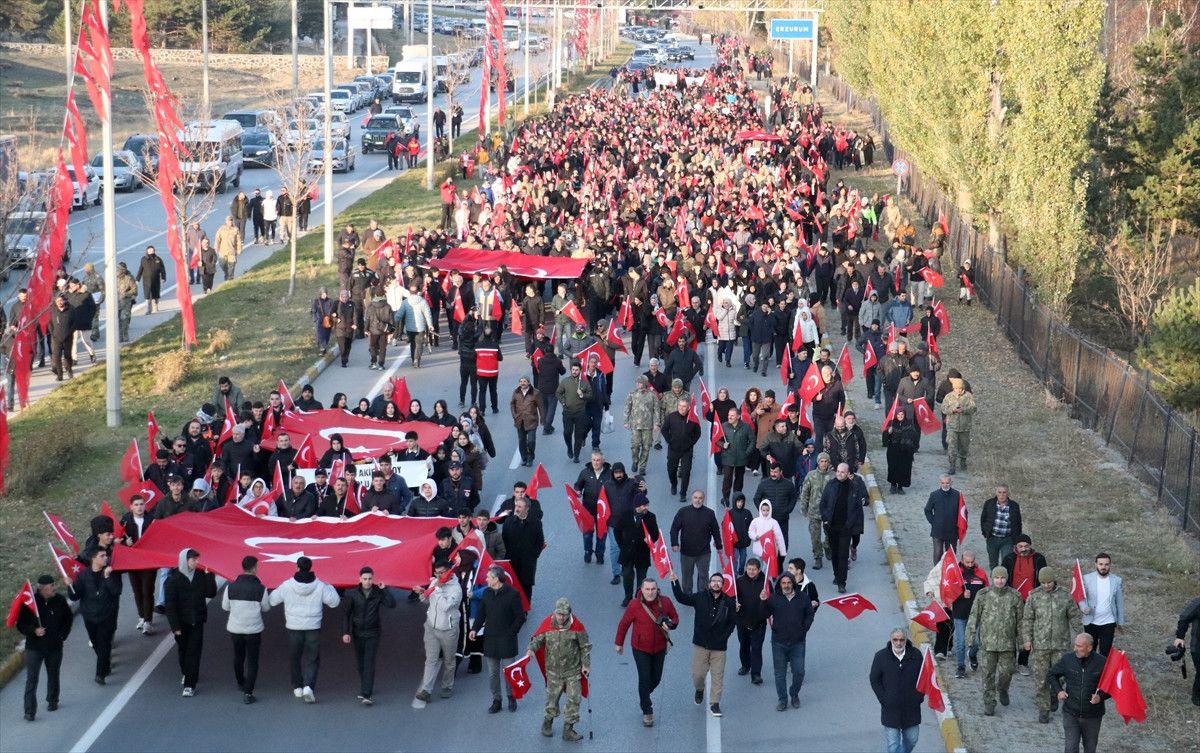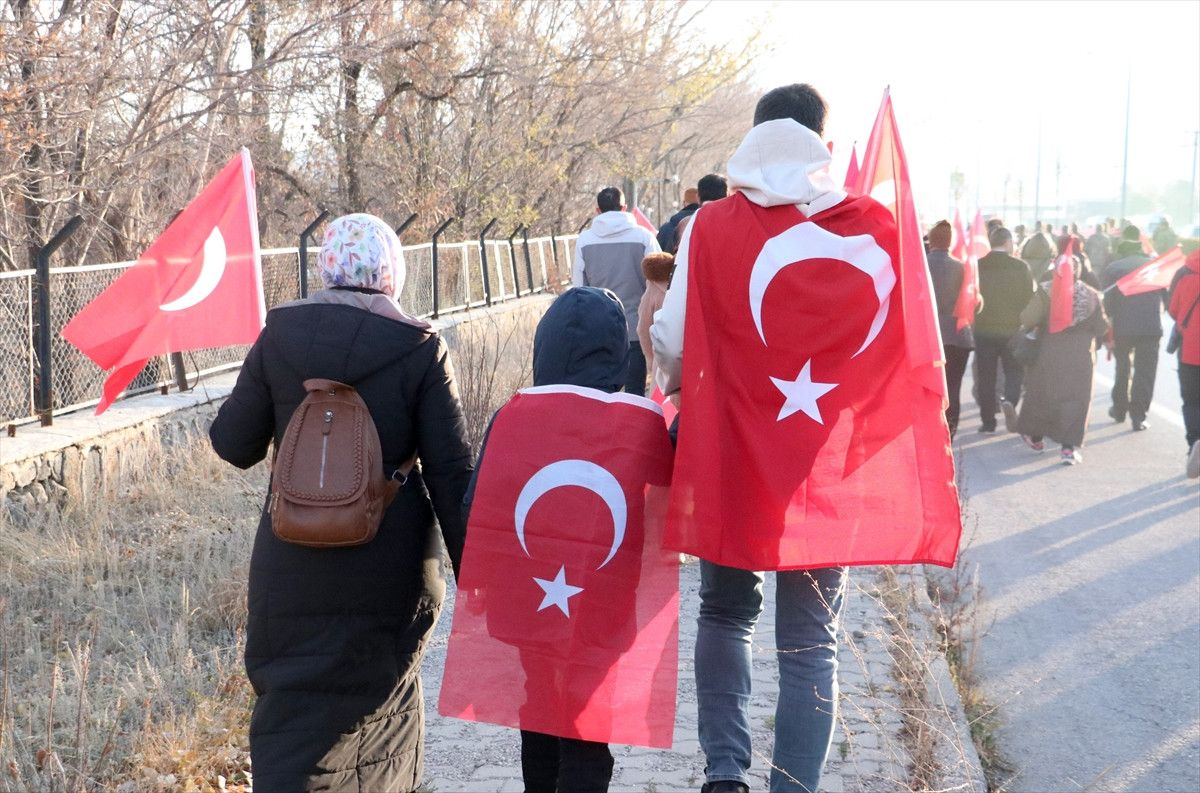 Çocuk ve yaşlıların da aralarında bulunduğu kalabalık, daha sonra sabahın erken saatlerinde soğuk havaya rağmen ellerindeki Türk bayraklarıyla Aziziye Tabyalarına yürüdü.