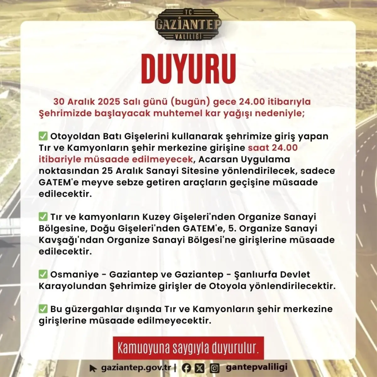 Gaziantep Valiliğinden yapılan açıklamada, otoyoldan Batı Gişeleri'ni kullanarak şehre giriş yapan tır ve kamyonların, saat 24.00'ten itibaren şehir merkezine alınmayacağı belirtildi. Bu araçların Acarsan Uygulama Noktası'ndan 25 Aralık Sanayi Sitesi'ne yönlendirileceği, yalnızca GATEM'e meyve ve sebze taşıyan araçların geçişine izin verileceği ifade edildi.