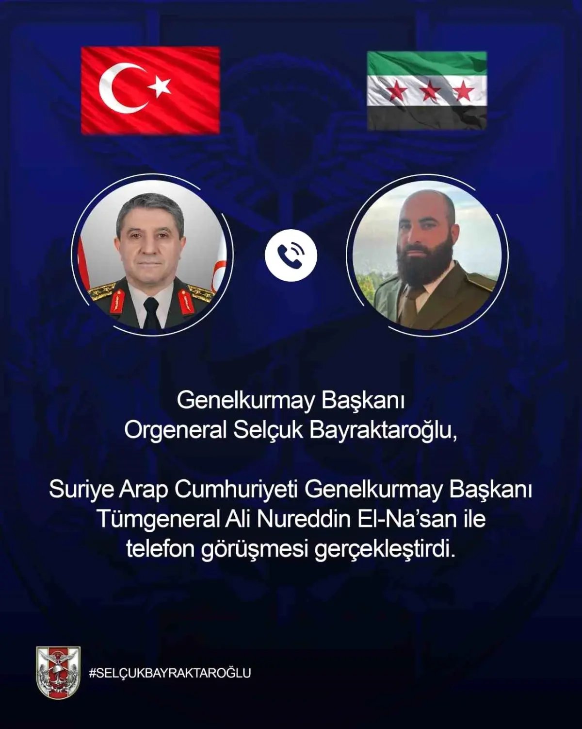 Türk Silahlı Kuvvetleri'nin (TSK) resmi sosyal medya hesabından yapılan açıklamada, Genelkurmay Başkanı Orgeneral Bayraktaroğlu'nun Suriye Arap Cumhuriyeti Genelkurmay Başkanı Tümgeneral Ali Nureddin El-Nas'an ile bir telefon görüşmesi gerçekleştirdiği belirtildi. Görüşmede gündeme ilişkin konuların değerlendirildiği bildirildi. - ANKARA