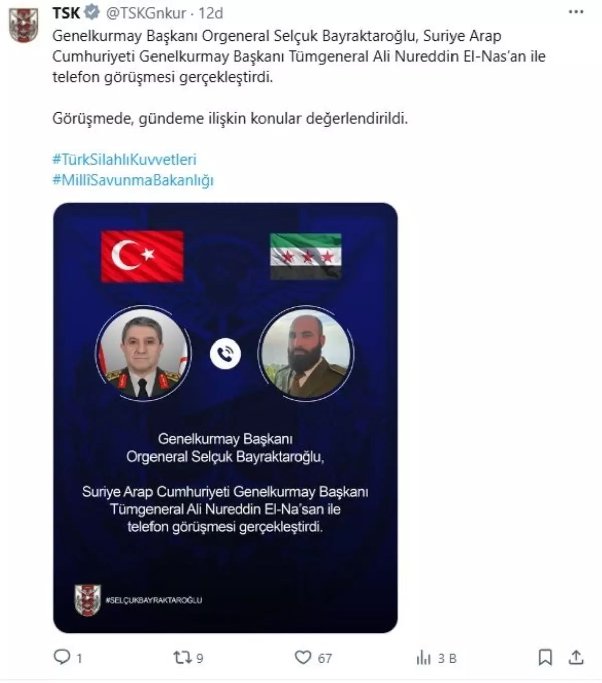 Türk Silahlı Kuvvetleri'nin (TSK) sanal medya hesabından yapılan açıklamada, "Genelkurmay Başkanı Orgeneral Selçuk Bayraktaroğlu, Suriye Arap Cumhuriyeti Genelkurmay Başkanı Tümgeneral Ali Nureddin El-Nas'an ile telefon görüşmesi gerçekleştirdi. Görüşmede, gündeme ilişkin konular değerlendirildi" denildi.