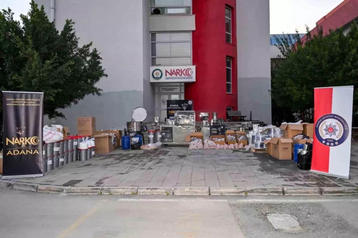İl Emniyet Müdürlüğü, Narkotik Suçlarla Mücadele Şube Müdürlüğü ekipleri, merkez Yüreğir ilçesi Havutlu Mahallesi'nde uyuşturucu satışı ve üretimi yapıldığı ihbarı üzerine çalışma başlattı. Bu kapsamda ekipler, Havutlu Mahallesi Yeni Sanayi Sitesi içerisinde Dönüştürme Merkezi olarak kullanılan 1 galeri, 2 iş yeri ve 2 araçta arama yaptı. Yapılan aramalarda 262 bin 473 uyuşturucu hap, 1 blister hazırlama makinesi, 1 kapsül doldurma makinesi, 1 kapsül temizleme makinesi, 1 karıştırma makinesi, 1 jeneratör, 2 kompresör makinesi, 3 milyon uyuşturucu hap yapabilecek 833 kilo 500 gram hammadde, 25 kilogram katkı maddesi, 972 bin boş kapsül ve çeşitli plastik malzemeler ele geçirildi.