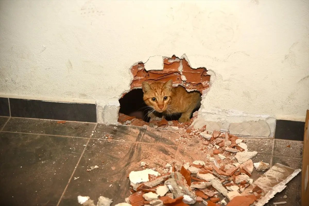 İhbar üzerine okula gelen itfaiye ekibi, kedinin bulunduğu yeri tespit ederek duvarı kırdı.