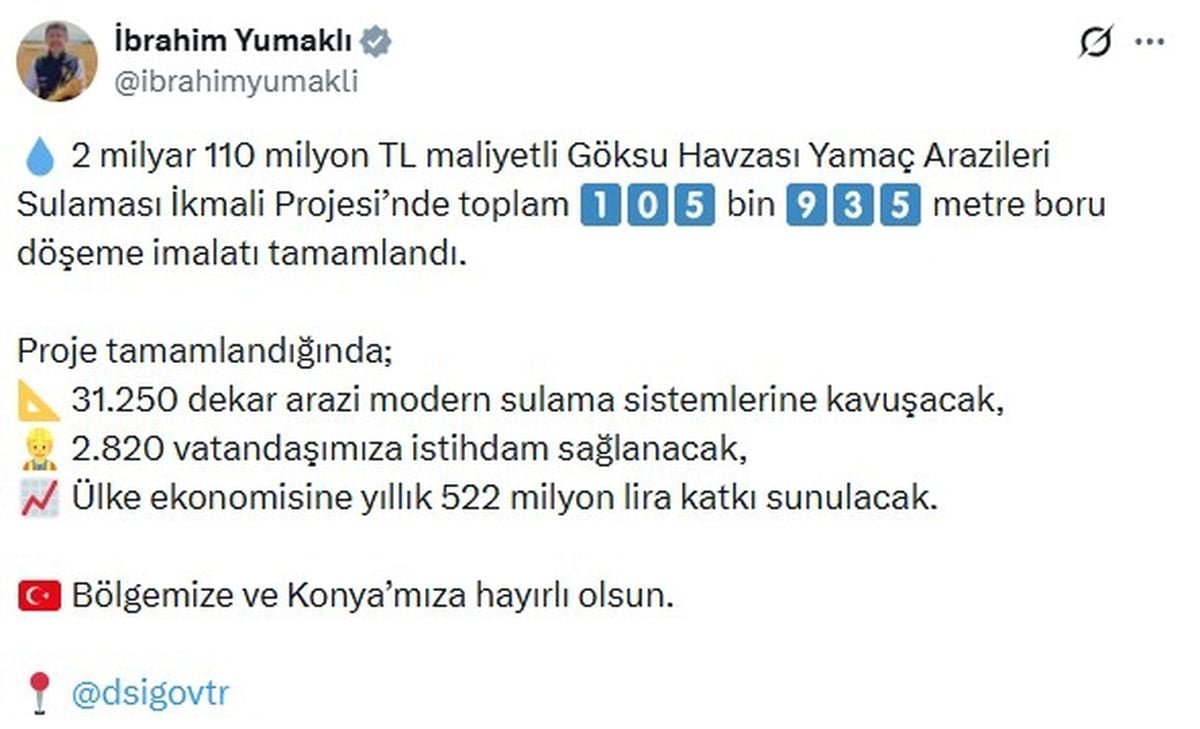 Bakan Yumaklı, sanal medya hesabından yaptığı açıklamada, "2 milyar 110 milyon TL maliyetli Göksu Havzası Yamaç Arazileri Sulaması İkmali Projesi'nde toplam 105 bin 935 metre boru döşeme imalatı tamamlandı. Proje tamamlandığında; 31 bin 250 dekar arazi modern sulama sistemlerine kavuşacak, 2 bin 820 vatandaşımıza istihdam sağlanacak, ülke ekonomisine yıllık 522 milyon lira katkı sunulacak. Bölgemize ve Konya'mıza hayırlı olsun" ifadelerini kullandı.