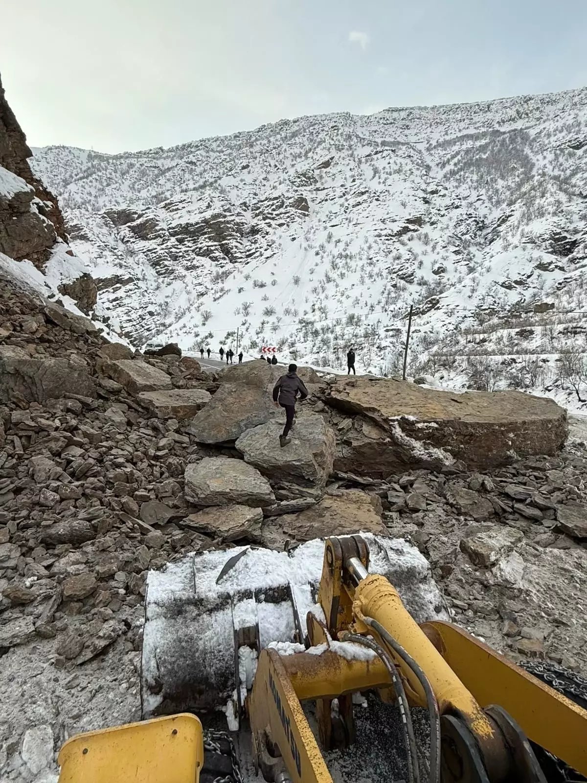 HAKKARİ-Çukurca karayolunun 50'nci kilometresinde dağdan kopan dev kaya parçaları yolu ulaşıma kapattı. Yolun açılması için ekipler çalışma başlattı.