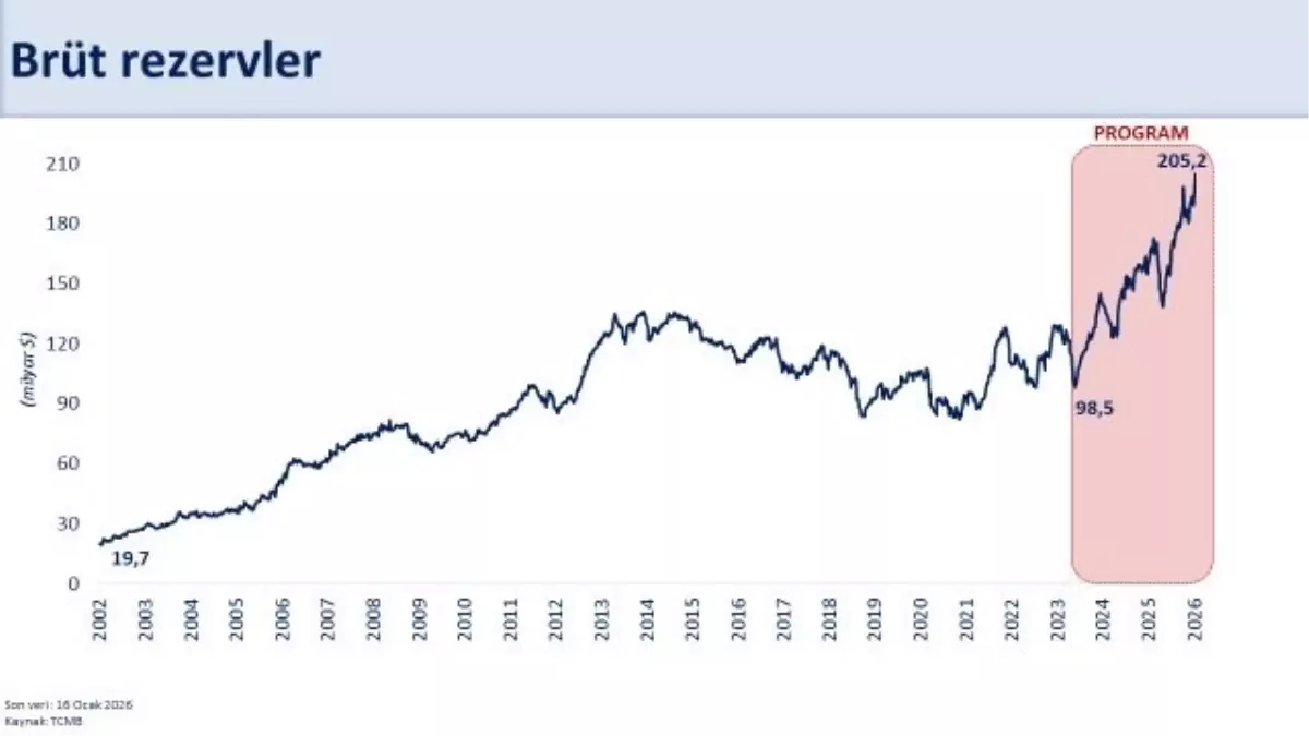 Hazine ve Maliye Bakanı Mehmet Şimşek, brüt rezervlerin 205,2 milyar dolara ulaştığını ve net rezervlerde 139,3 milyar dolarlık artış sağlandığını açıkladı. Ayrıca döviz pozisyonunda toplam 280 milyar doları aşan bir iyileşmenin gerçekleştiğini belirtti.