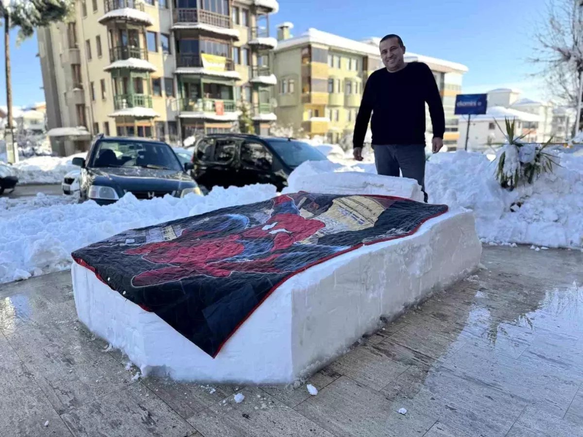 Safranbolu'da etkili olan kar yağışının ardından ilginç görüntüler ortaya çıktı. Emek Mahallesinde esnaflık yapan Özcan Doğangönül, dükkanının önünde biriken karları şekillendirerek yatak formuna dönüştürdü.