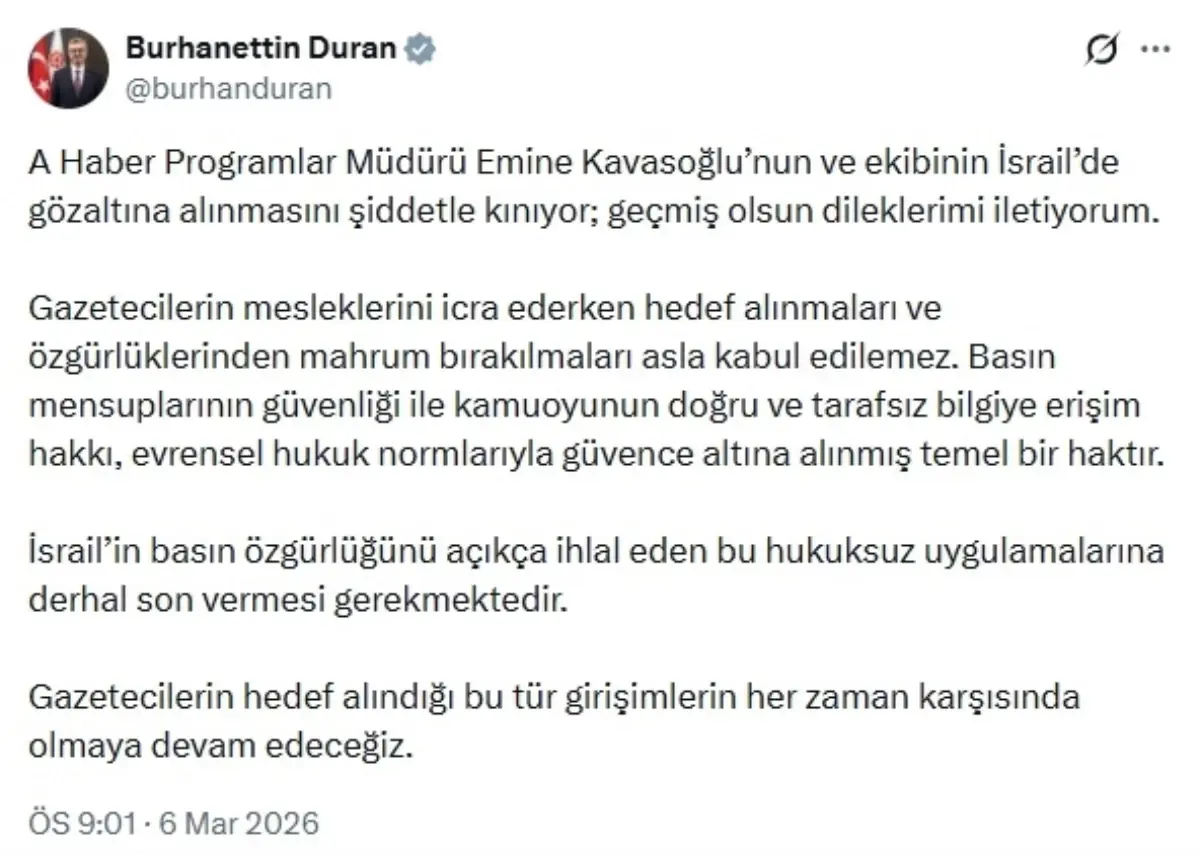 İletişim Başkanı Burhanettin Duran, A Haber Programlar Müdürü Emine Kavasoğlu ve ekibinin İsrail'de gözaltına alınmasını kınadı ve basın özgürlüğünün önemine vurgu yaptı.