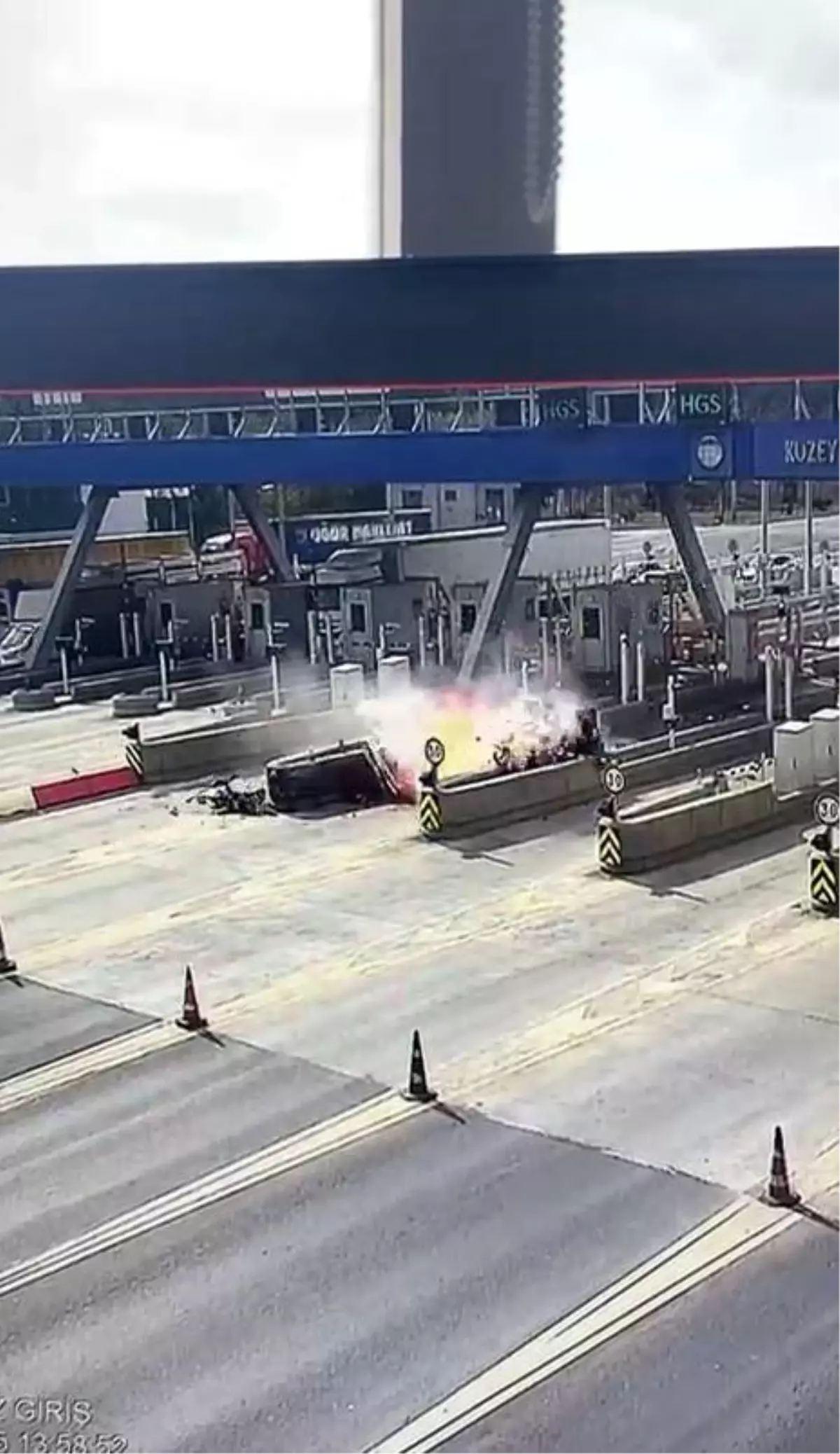 İstanbul Kuzey Marmara Otoyolu gişelerinde bir kişi kiraladığı otomobille beton refüje çarptı. Takla atan araç parçalanarak yandı. Sürücü hayatını kaybederken kaza anı kameraya yansıdı.