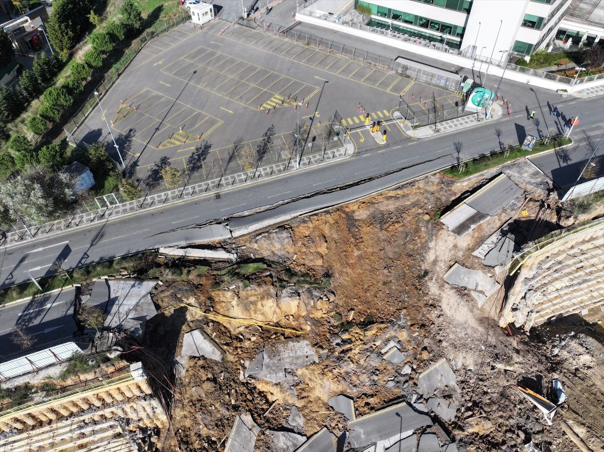 Ümraniye'de bir inşaat alanında yapılan çalışmalar sırasında istinat duvarının yıkılması sonucu yolda çökme meydana geldi. Korku dolu anlar bir vatandaşın cep telefonu kamerasına yansıdı.