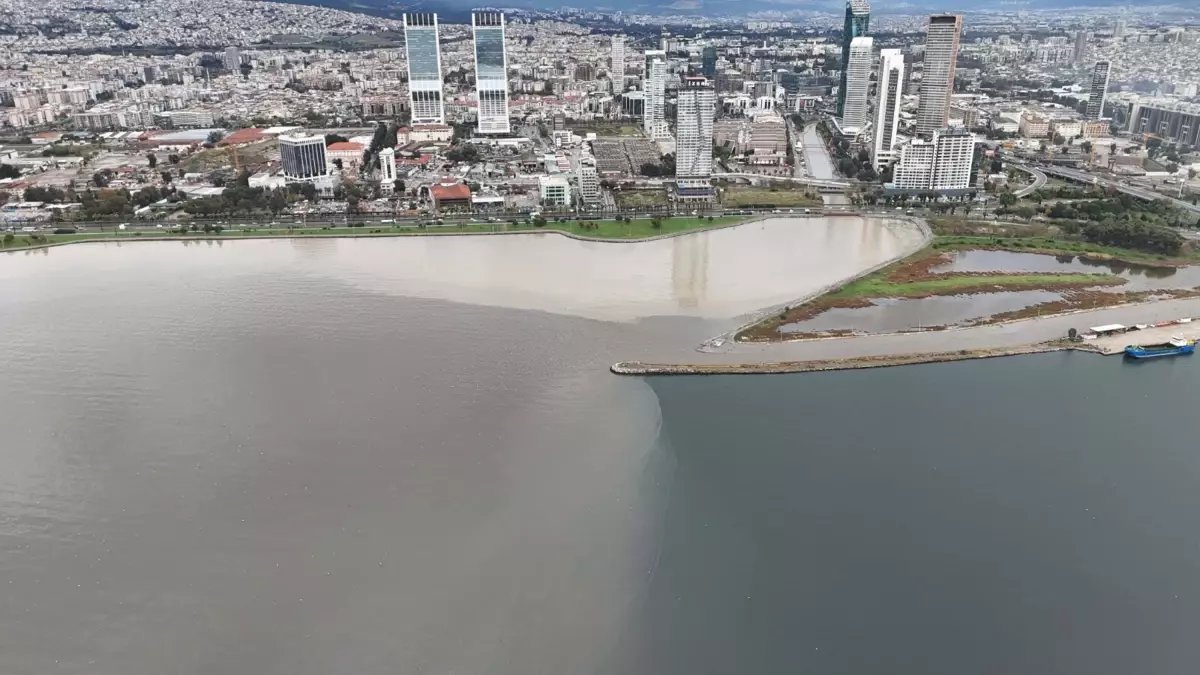 İzmir'de etkili olan gök gürültülü sağanak nedeniyle İzmir Körfezi'nin bazı bölgeleri kahverengiye büründü. Çamurlu suyun denize akması renk değişikliğine yol açtı.