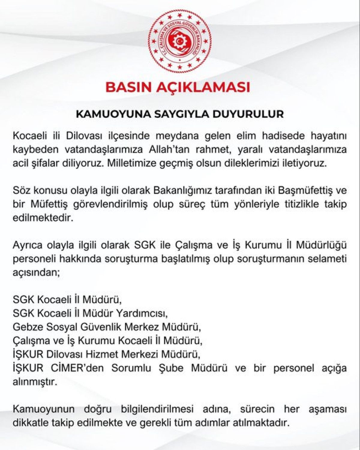 Çalışma ve Sosyal Güvenlik Bakanlığı, Kocaeli’nin Dilovası ilçesinde, 6 kişinin öldüğü kozmetik fabrikasında yaşanan yangın nedeniyle 7 kişinin açığa alındığını açıkladı.