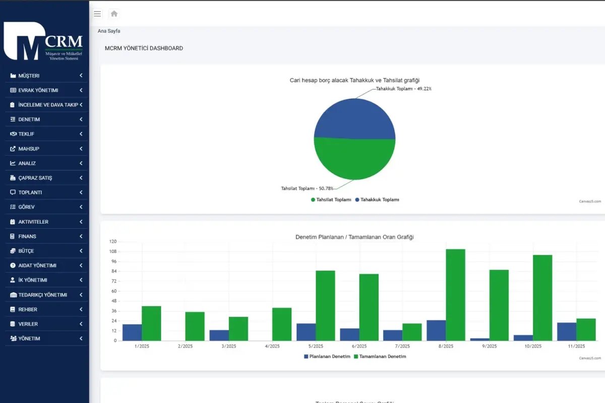 "Müşteri ilişkileri, süreç, tahsilat, kârlılık, denetim, görev takibi, personel işlemleri, takvim entegrasyonları, ofis içi kapalı devre mesajlaşma özelliği, süreli belge hatırlatma modülleri, mahsup ve iade işlemlerinin tek ekrandan takibi, TTK (Türk Ticaret Kanunu) işlemlerinin takibi ile kârlılık analizleri, dijital arşiv ve daha birçok modül ve özellikleri ile tüm kritik operasyonları, tek merkezden yönetiyoruz. Bu platformu, özellikle denetim şirketlerinde dağınık ve manuel yürütülen süreçleri dijitalleştirerek operasyonel verimliliği artırmak amacıyla sektöre sunuyoruz. Tahsilat takibinden kârlılık yönetimine kadar her aşamada tam kontrol ve şeffaflık sağlayan, sürdürülebilir bir yönetim modeli oluşturuyoruz."