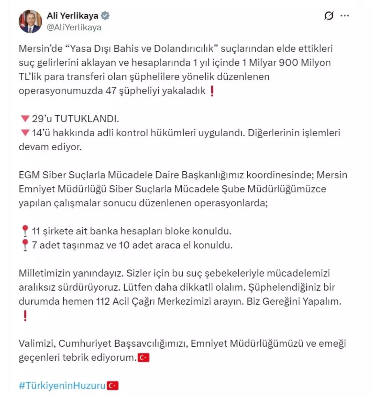 Bakan Ali Yerlikaya, sanal medya hesabından yaptığı açıklamada, "Mersin'de 'yasa dışı bahis ve dolandırıcılık' suçlarından elde ettikleri suç gelirlerini aklayan ve hesaplarında 1 yıl içinde 1 milyar 900 milyon TL'lik para transferi olan şüphelilere yönelik düzenlenen operasyonumuzda 47 şüpheliyi yakaladık. 29'u tutuklandı. 14'ü hakkında adli kontrol hükümleri uygulandı. Diğerlerinin işlemleri devam ediyor. EGM Siber Suçlarla Mücadele Daire Başkanlığımız koordinesinde; Mersin Emniyet Müdürlüğü Siber Suçlarla Mücadele Şube Müdürlüğümüzce yapılan çalışmalar sonucu düzenlenen operasyonlarda; 11 şirkete ait banka hesapları bloke konuldu. 7 adet taşınmaz ve 10 adet araca el konuldu" dedi.