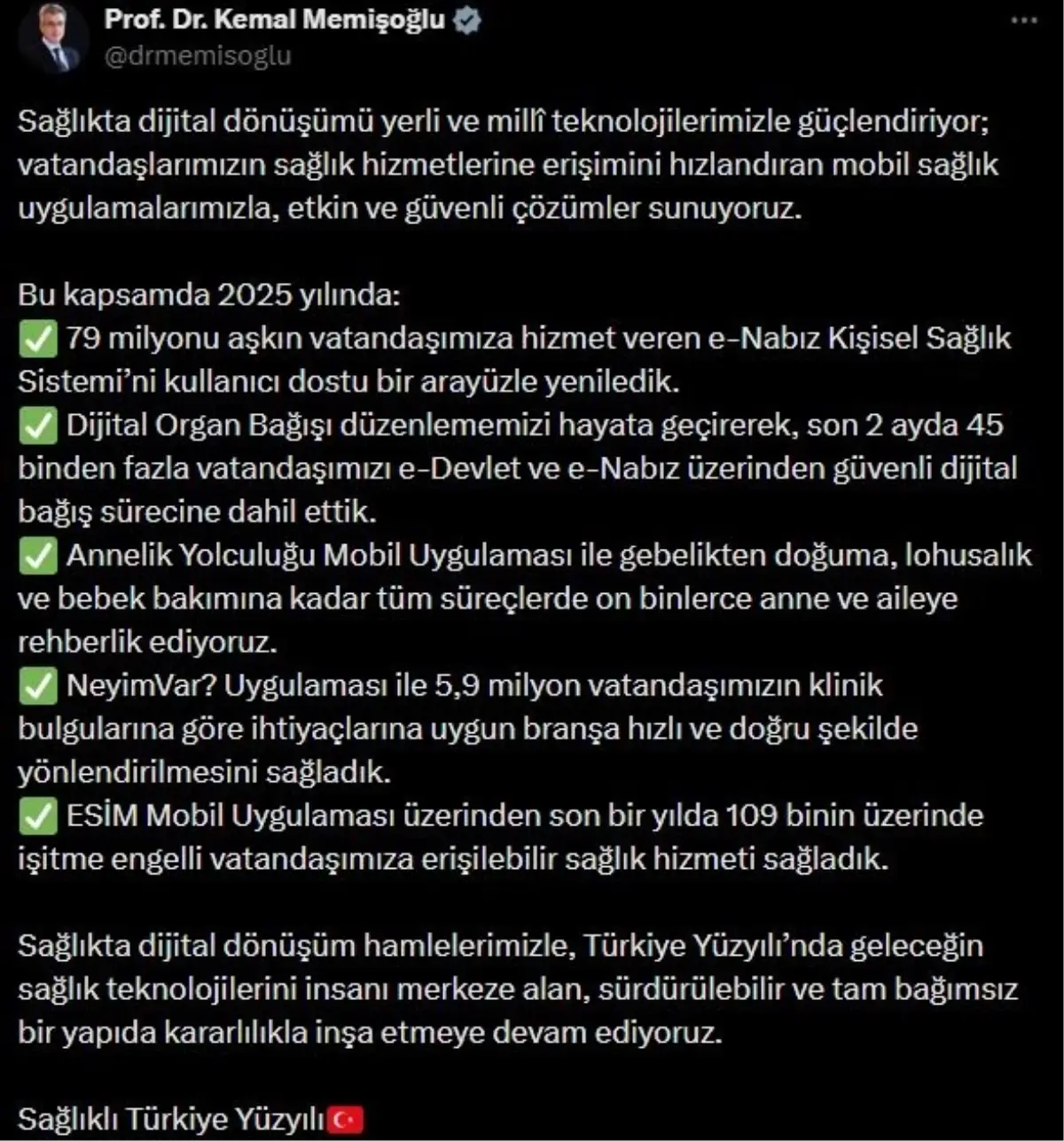 Bakan Memişoğlu, sanal medya hesabından yaptığı açıklamada, "Sağlıkta dijital dönüşümü yerli ve milli teknolojilerimizle güçlendiriyor, vatandaşlarımızın sağlık hizmetlerine erişimini hızlandıran mobil sağlık uygulamalarımızla, etkin ve güvenli çözümler sunuyoruz. Bu kapsamda 2025 yılında 79 milyonu aşkın vatandaşımıza hizmet veren e-Nabız Kişisel Sağlık Sistemi'ni kullanıcı dostu bir arayüzle yeniledik. Dijital Organ Bağışı düzenlememizi hayata geçirerek, son 2 ayda 45 binden fazla vatandaşımızı e-Devlet ve e-Nabız üzerinden güvenli dijital bağış sürecine dahil ettik. Annelik Yolculuğu Mobil Uygulaması ile gebelikten doğuma, lohusalık ve bebek bakımına kadar tüm süreçlerde on binlerce anne ve aileye rehberlik ediyoruz. 'NeyimVar?' Uygulaması ile 5,9 milyon vatandaşımızın klinik bulgularına göre ihtiyaçlarına uygun branşa hızlı ve doğru şekilde yönlendirilmesini sağladık. ESİM Mobil Uygulaması üzerinden son bir yılda 109 binin üzerinde işitme engelli vatandaşımıza erişilebilir sağlık hizmeti sağladık. Sağlıkta dijital dönüşüm hamlelerimizle, Türkiye Yüzyılı'nda geleceğin sağlık teknolojilerini insanı merkeze alan, sürdürülebilir ve tam bağımsız bir yapıda kararlılıkla inşa etmeye devam ediyoruz" ifadelerini kullandı.