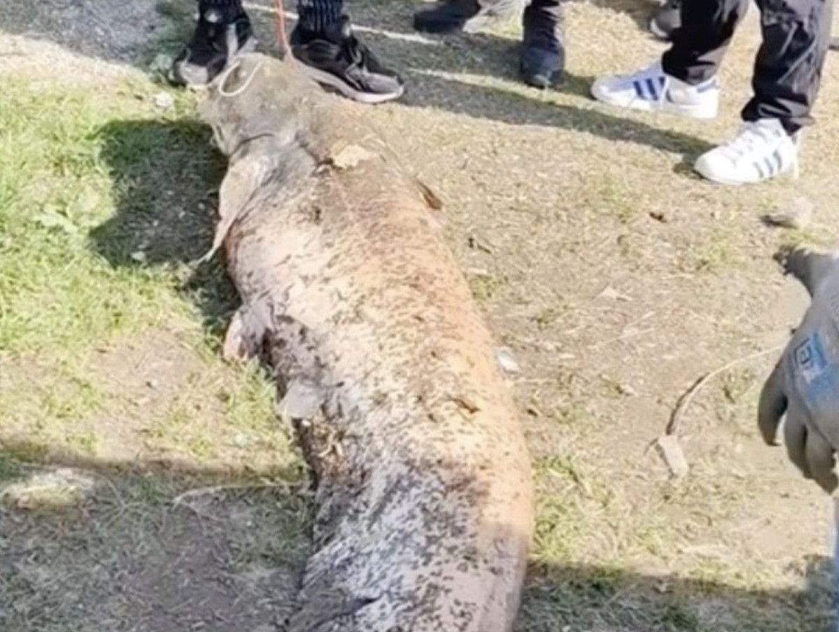 Cep telefonu kamerasına yansıyan görüntülerde, karaya çıkarılan balığın büyüklüğü dikkati çekti.