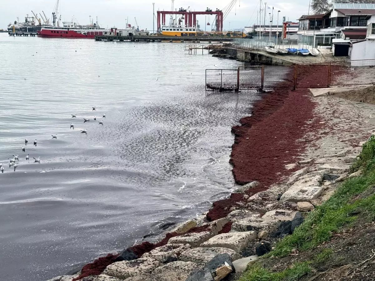 Tekirdağ'da etkili olan poyraz, deniz yüzeyindeki yosunları kıyıya sürükleyerek sahil hattının kırmızı renge bürünmesine neden oldu. Vatandaşlar, sahildeki bu ilginç manzara karşısında şaşkınlık yaşadı.