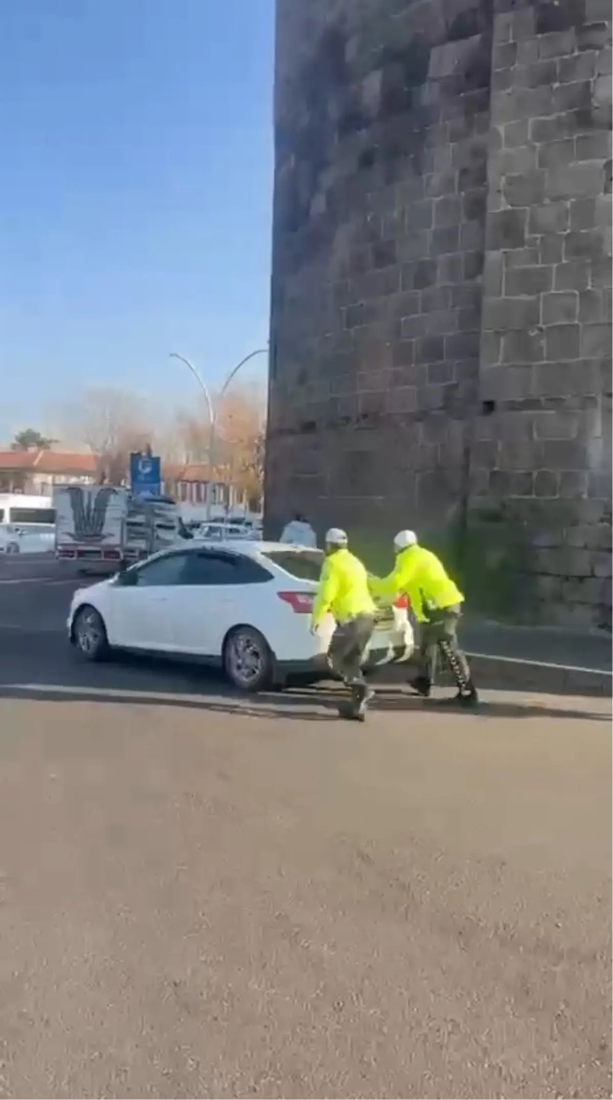 Olay, sabah saatlerinde Sur ilçesi Dağkapı Kavşağı'nda meydana geldi. Sürücüsü ve plakası öğrenilemeyen otomobil, kavşakta arızalandı. Durumu fark eden kavşakta görevli polis memurları, otomobili itip güvenli alana çekerek sürücüye yardım etti. O anlar ise cep telefonu kamerasıyla görüntülendi.