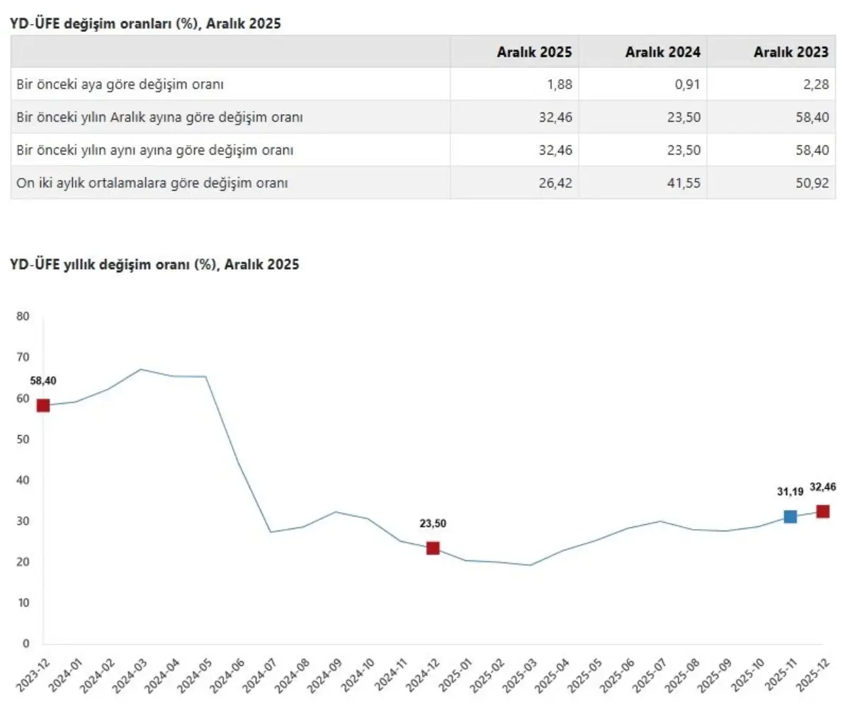 TÜİK, Aralık 2025 dönemine ilişkin yurt dışı üretici fiyat endeksi verilerini açıkladı. Buna göre; yurt dışı üretici fiyatları aralık ayında bir önceki aya göre yüzde 1,88, bir önceki yılın aynı ayına göre yüzde 32,46 ve 12 aylık ortalamalara göre yüzde 26,42 arttı.