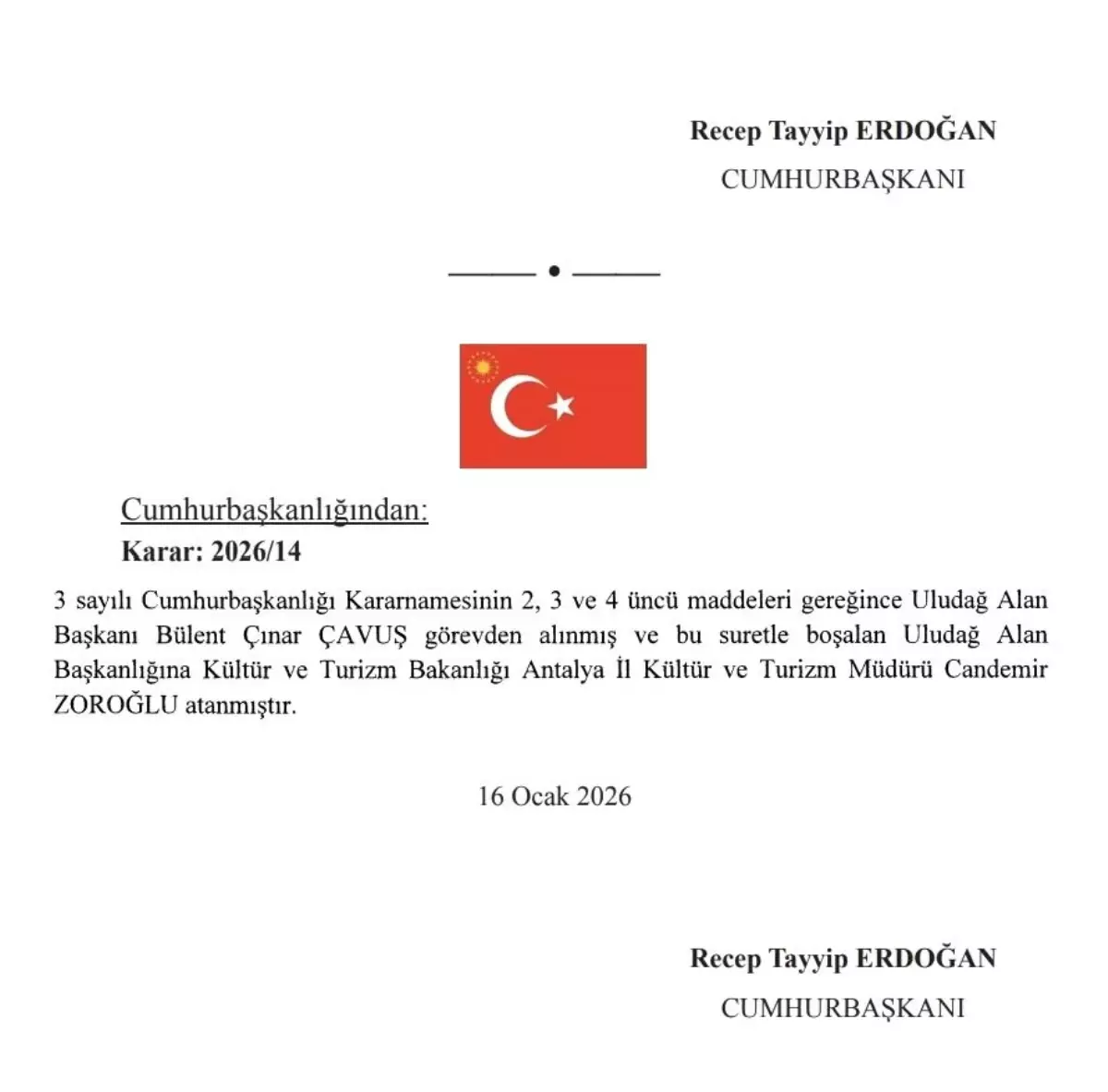 17 Ocak 2026 Cumartesi günü yayımlanan Resmi Gazete kararlarına göre, 3 sayılı Cumhurbaşkanlığı Kararnamesinin 2, 3 ve 4'üncü maddeleri gereğince Uludağ Alan Başkanı Bülent Çınar Çavuş görevden alındı. Çavuş'tan boşalan Uludağ Alan Başkanlığı görevine, Kültür ve Turizm Bakanlığı Antalya İl Kültür ve Turizm Müdürü Candemir Zoroğlu atandı.